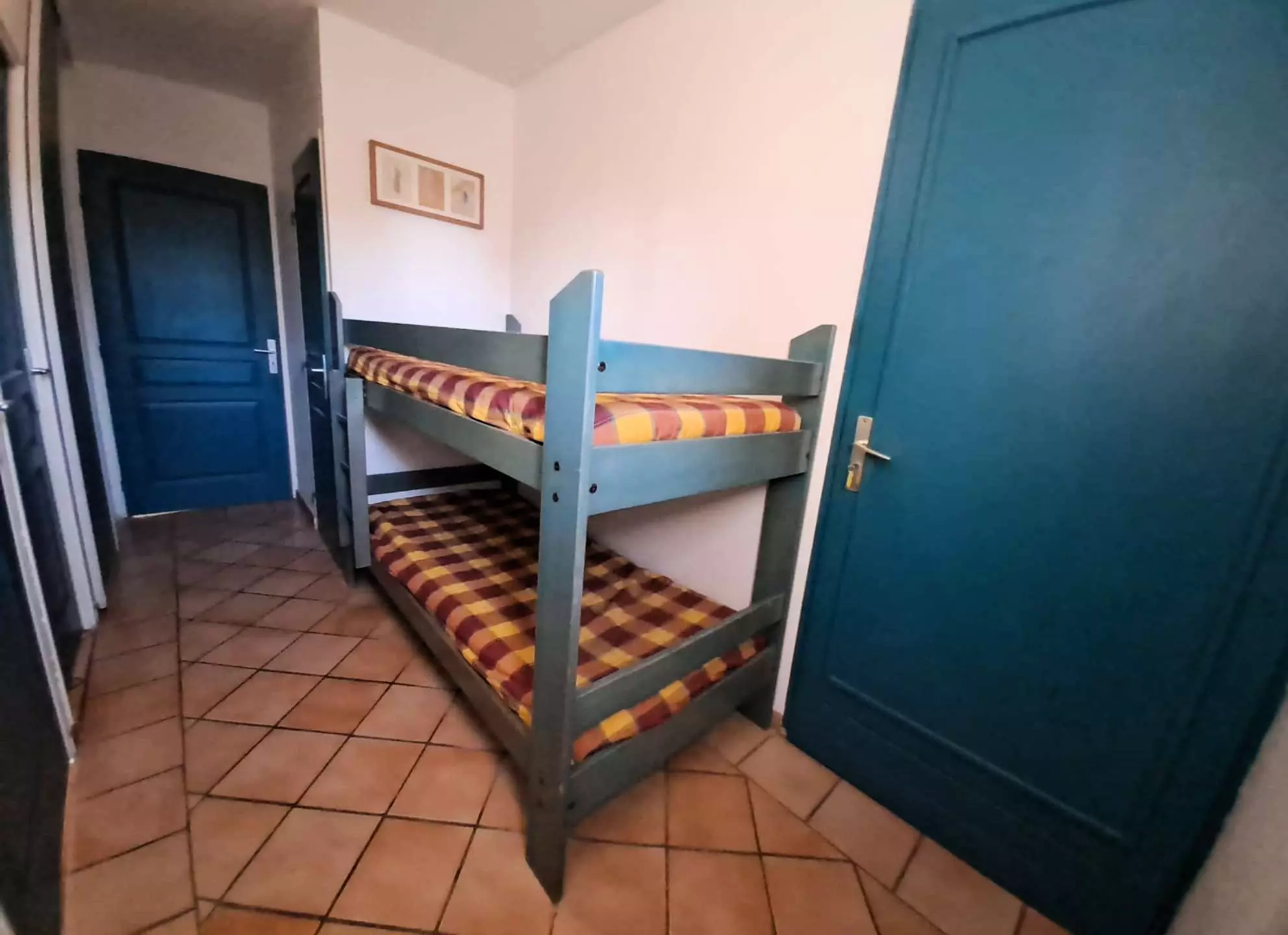 The entrance consists of a sleeping area cabin (bunk beds), then opens onto the living room facing the terrace with a view of the swimming pool, and its dining area with an electric plancha.