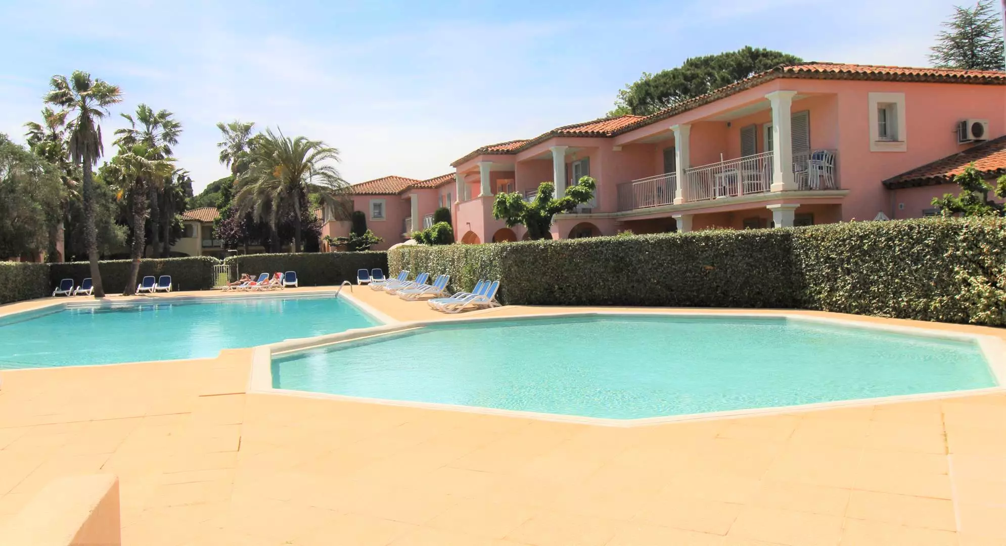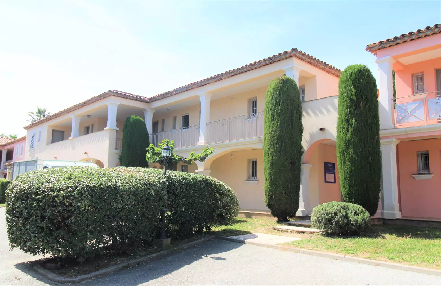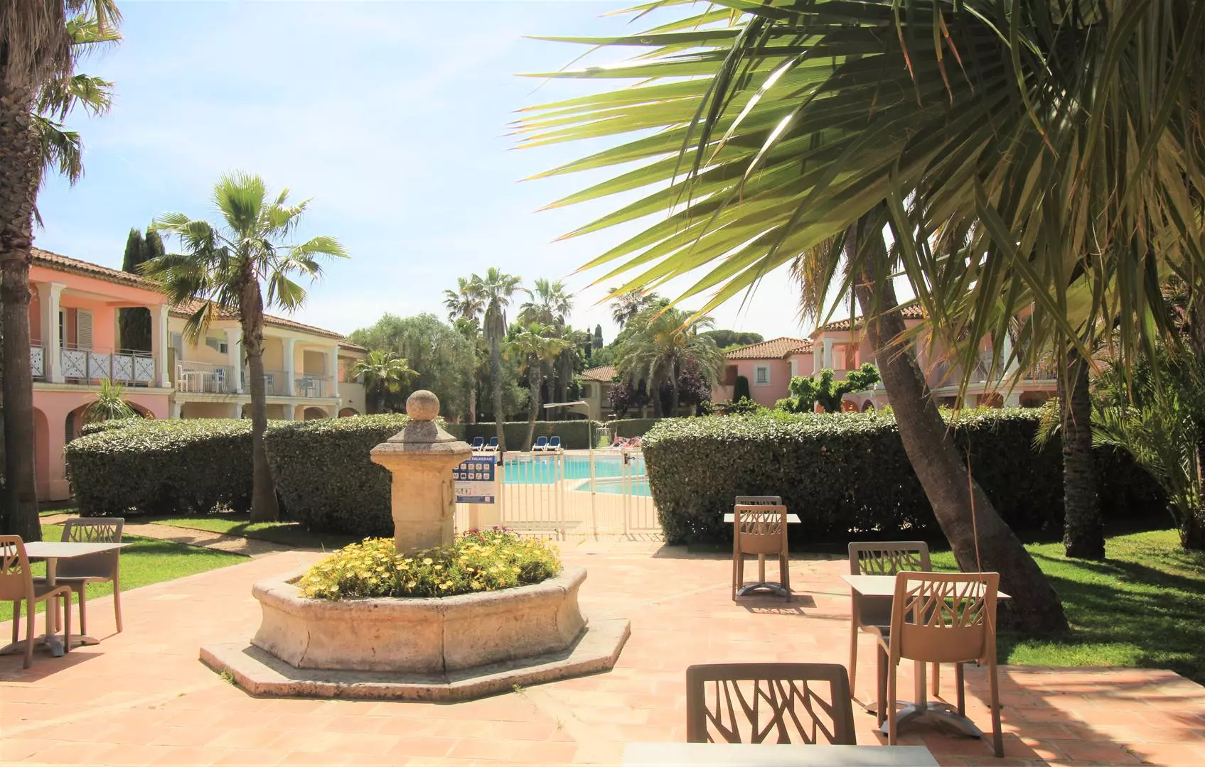 At the foot of the historic village of Grimaud, pretty cabin apartment with terrace in a pleasant, quiet, secure residence, surrounded by a wooded park with two heated swimming pools, a multi-sports ground (tennis, basketball, football), a ping-pong table, and children's games.