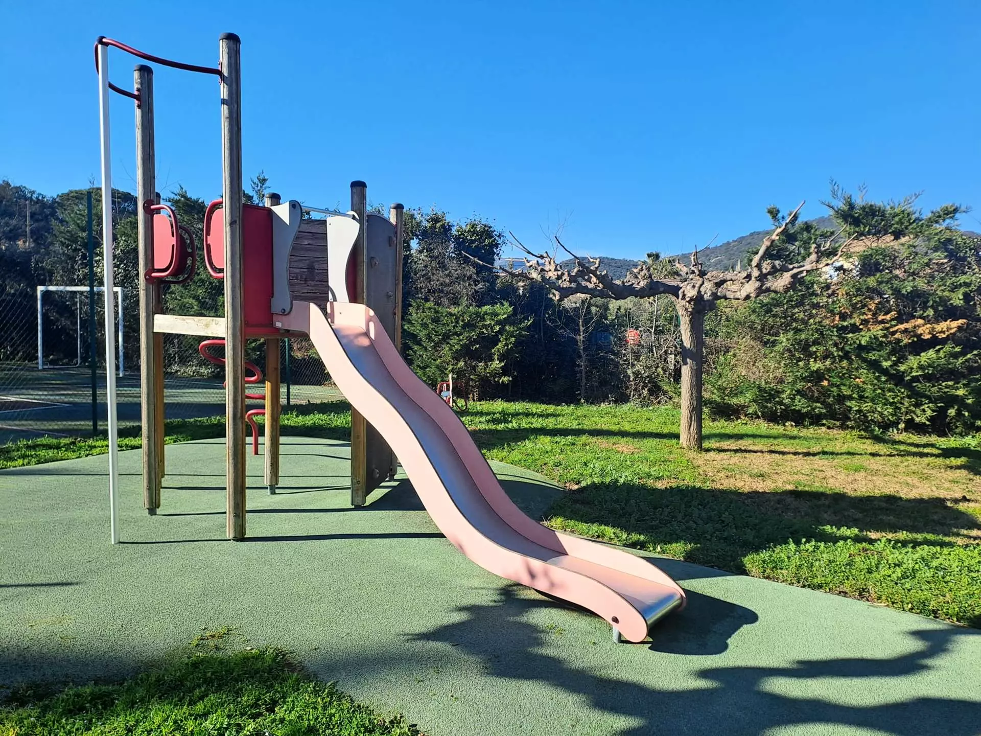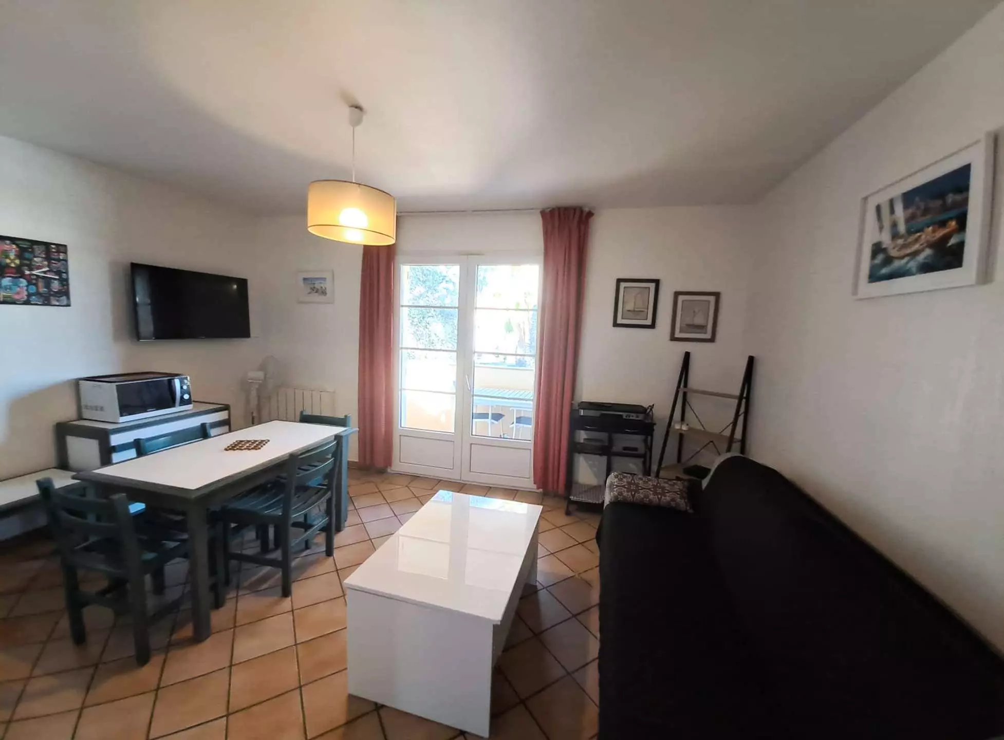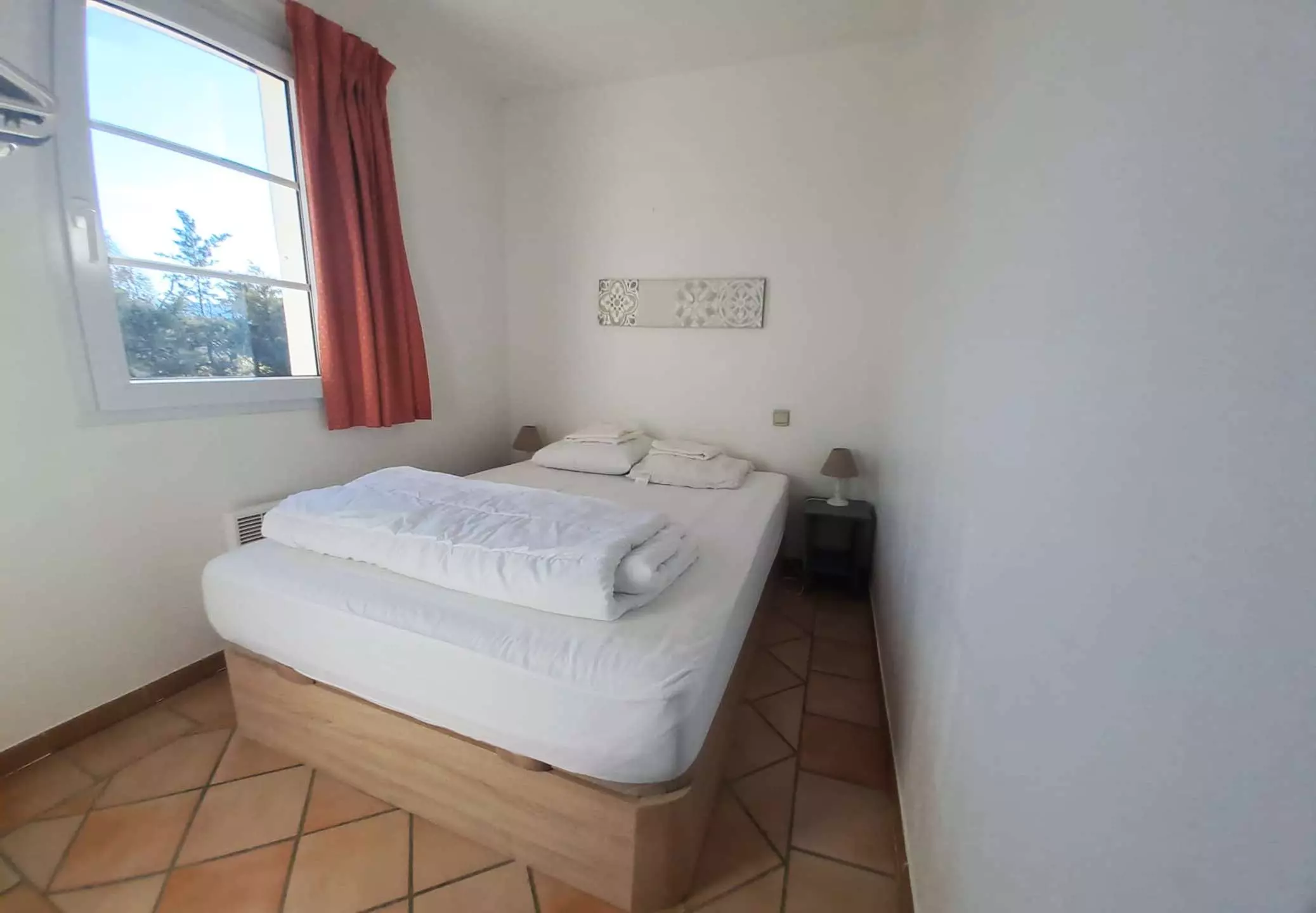 At the foot of the historic village of Grimaud, pretty cabin apartment with terrace in a pleasant, quiet, secure residence, surrounded by a wooded park with two heated swimming pools, a multi-sports ground (tennis, basketball, football), a ping-pong table, and children's games.