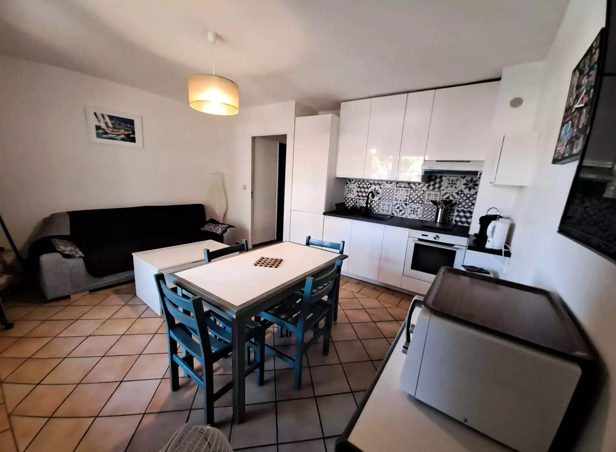 The living room, furnished with a 3-seater sofa, and the dining area with a dining table, open onto the fully equipped American kitchen.