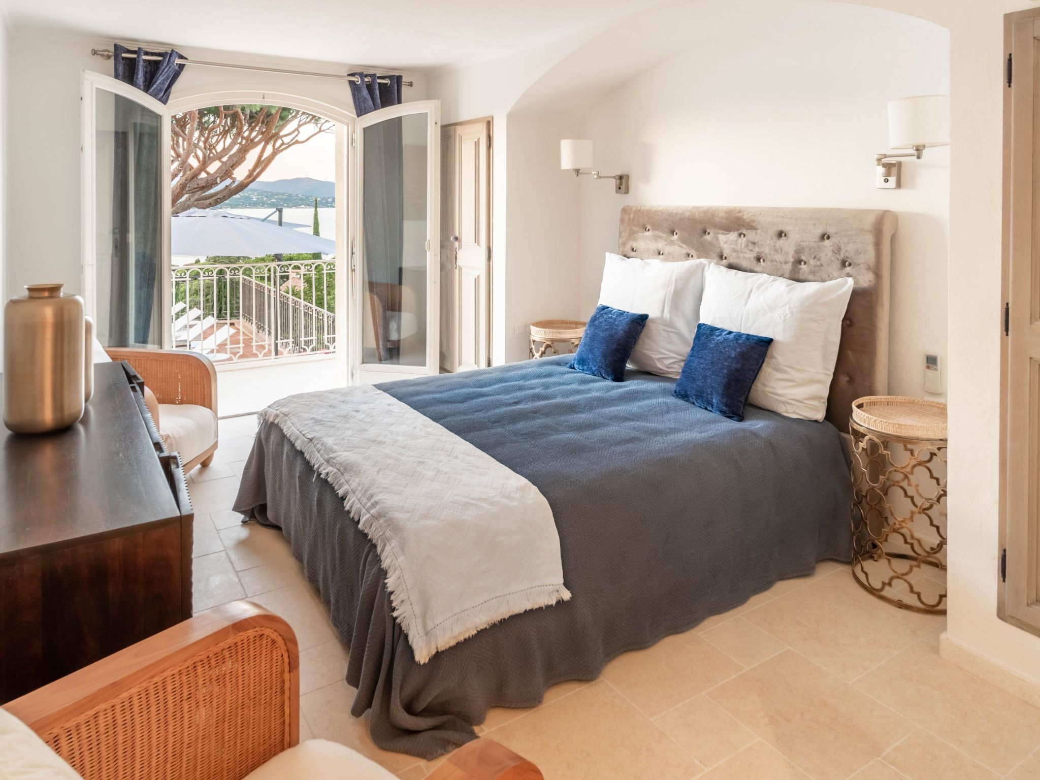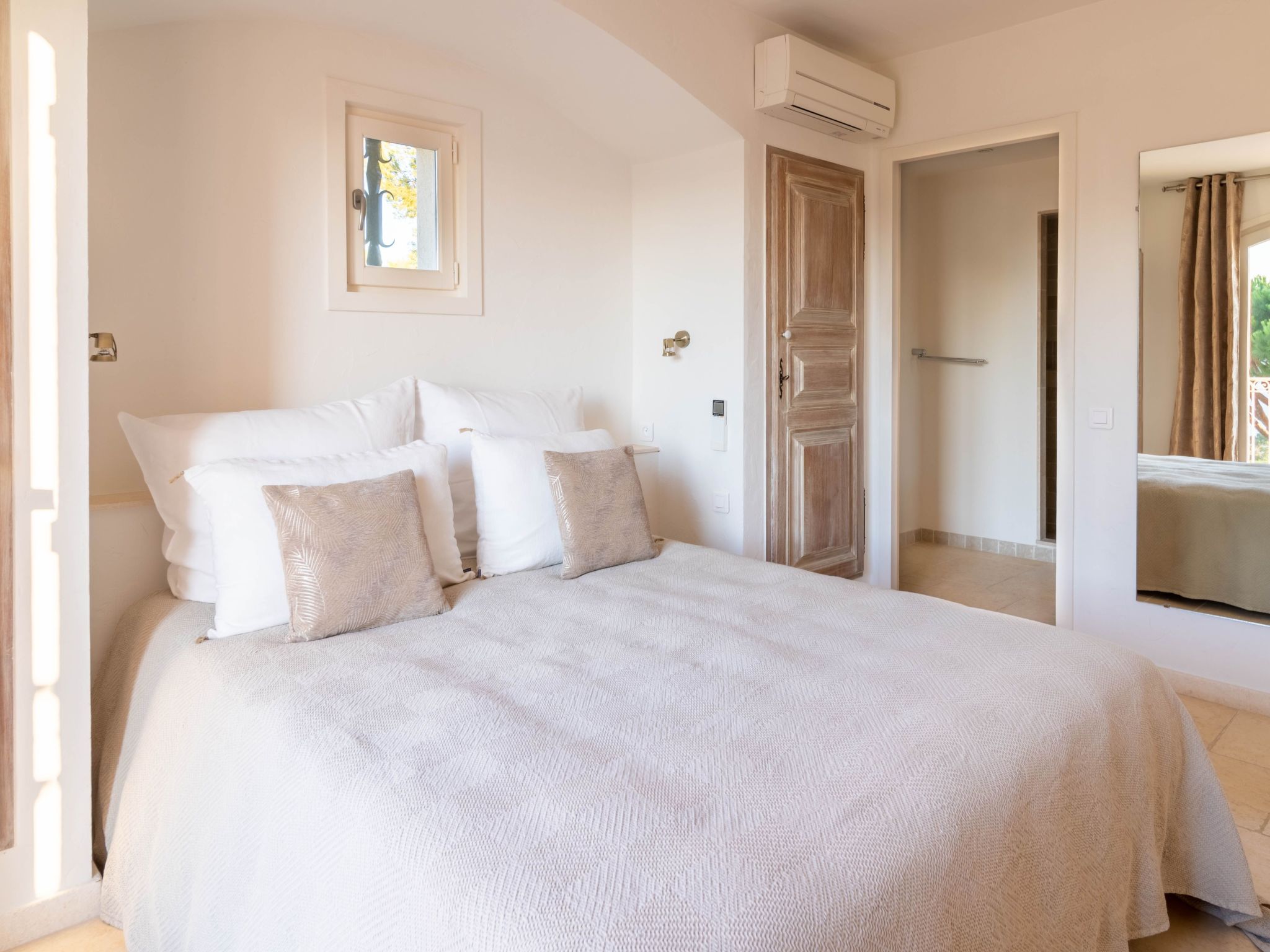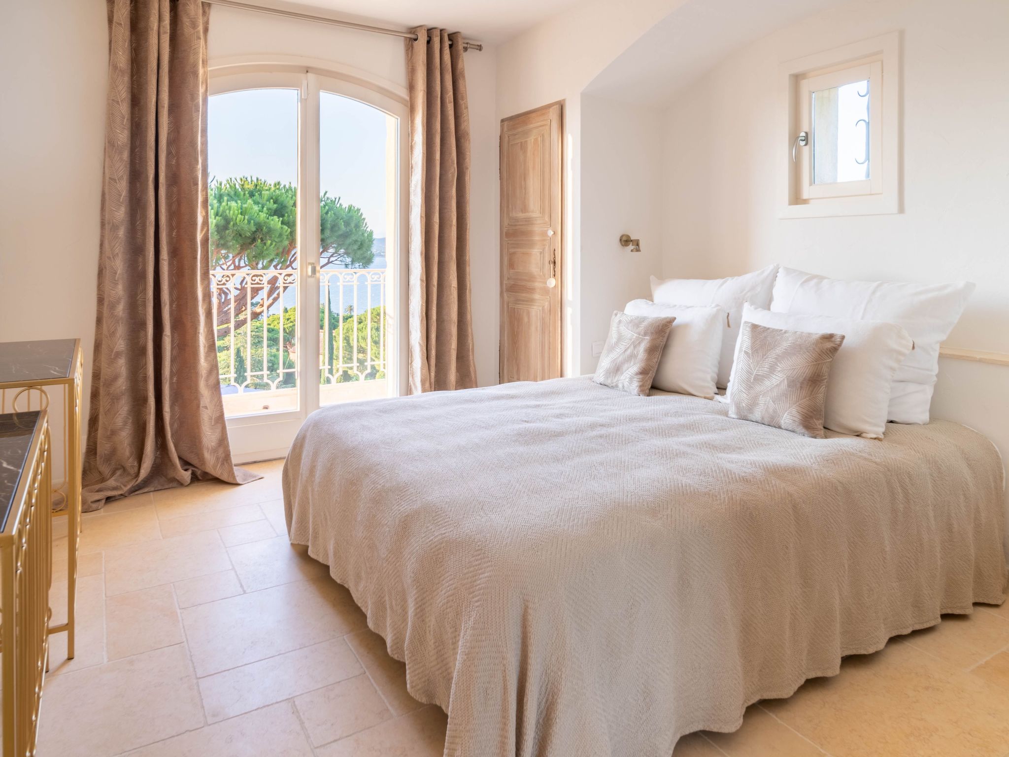 The villa is approximately 200 m2 and can accommodate up to 10 adults. It has been recently renovated and furnished with great taste and attention to detail to ensure comfort and well-being.One of the highlights of the villa is that it offers panoramic views over the Mediterranean Sea and the Gulf of Saint-Tropez.Access to the property is via an electric gate and a pretty pavement leading directly to the entrance and covered parking. The house has been built on a sloping plot and extends over two levels.On the upper level there is a bright living room with sofas and fireplace, a dining table for 10 visually separating the living room from the fully equipped open-plan kitchen, and a master bedroom with king-size bed, fitted wardrobes and en-suite bathroom.On the lower level there are the other four bedrooms: a master bedroom with king-size bed, fitted wardrobes and en-suite bathroom, two bedrooms sharing a bathroom and a bedroom with en-suite bathroom.Other amenities: WIFI, SONOS sound system, TV with international channels, fireplace, air conditioning and heating in all rooms, washing machine and tumble dryer, large soundproof windows, new, good-quality furniture and appliances, bath and pool towels, bed linen, daily professional cleaning except Sundays, concierge service on request.