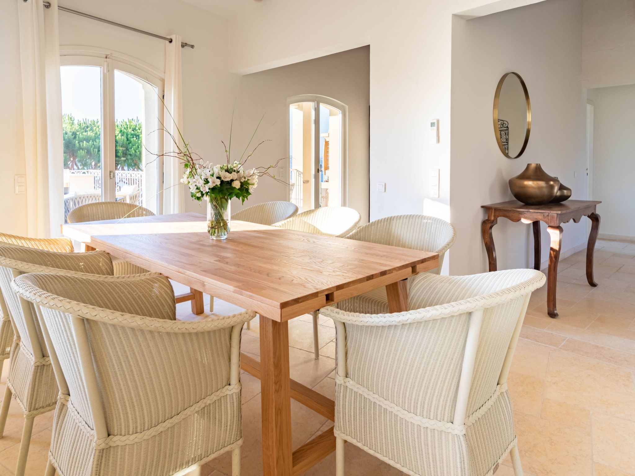 The villa has a heated swimming pool, terraces and garden with garden furniture, outdoor dining table for 8 people, sun loungers and a dry sauna located next to the swimming pool.Other amenities: Private parking for two cars, outside lights