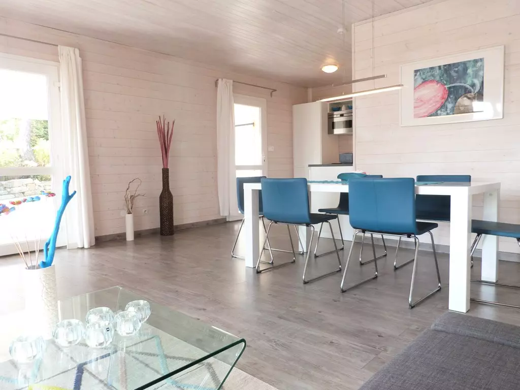 The house consists of a living room with a sofa bed (sleeps 2), a fully equipped open kitchen, a bedroom with a double bed, a bedroom with 2 bunk beds, and a bathroom with WC.
